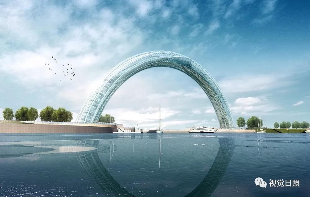 遠(yuǎn)觀大橋,彩虹形橋體呼應(yīng)“日出初光先照”之意,如一輪剛剛升起的紅日坐落在海平面上,在每天日出之時,橋體與自身倒影相映成趣,以初升之日點(diǎn)睛,形成壯美的巨目形象。